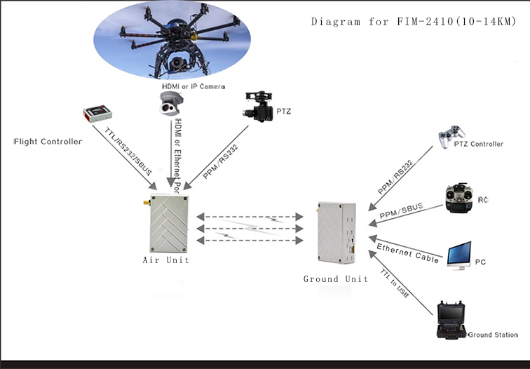 FIM-2410 is special designed for high speed uav data transmission in movement. The transmit rate up to 3~5Mbps with H.265 video compression techonolgy, which can meet high quality video, audio and data transmission.