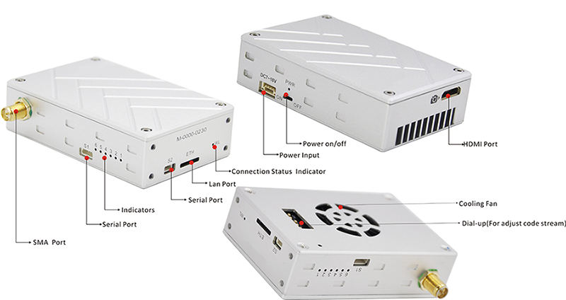 Both Tx and Rx has a Ethernet Port support UDP multicast/TCP/IP and supply 2way LAN link from ai to ground. The Serial port connect with Pixhawk controller and GCS and HDMI port support HD video input